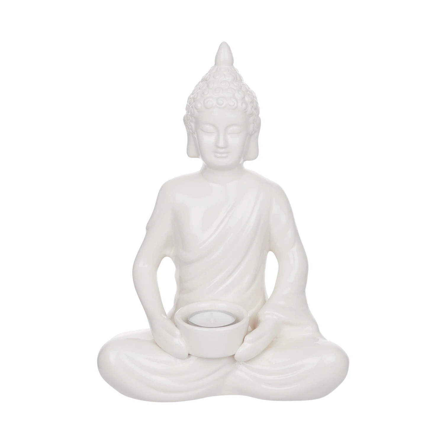 Ruhe und Erleuchtung bringt die weiße Buddha Deko Statue mit Teelichthalter in Ihr Zuhause. Mit einer Höhe von gut 28 cm lässt sich die dekorative Buddha Figur aus Dolomit gut als Blickfang inszenieren, z.B. im Bad, im Schlafzimmer oder Wohnbereich. Wer mag, schmückt das Drumherum noch mit Windlichtern, Laternen, Kerzen oder frischen Blumen.