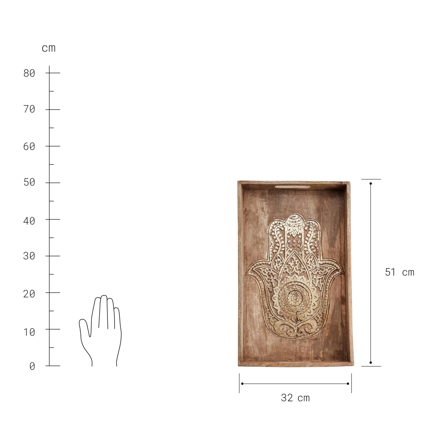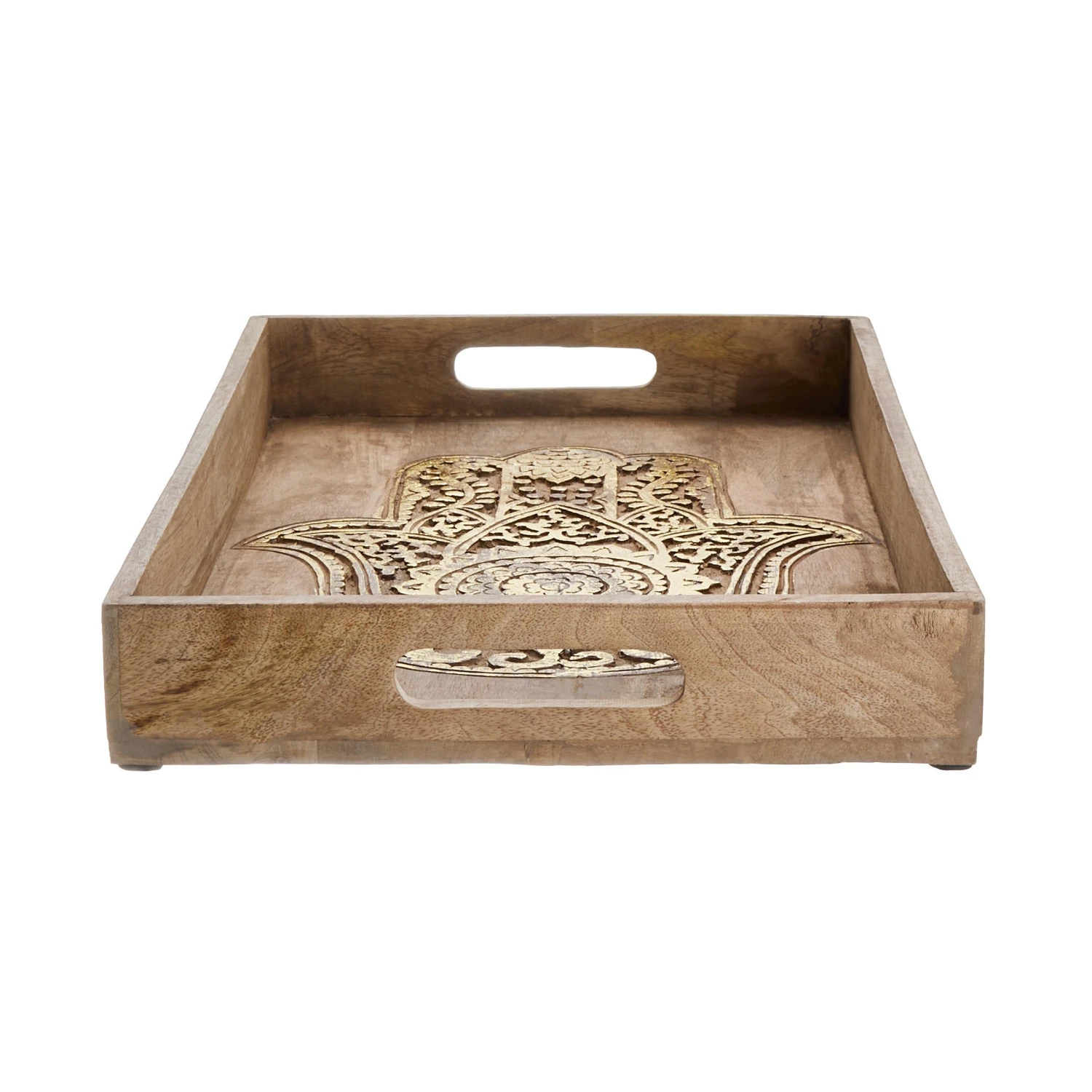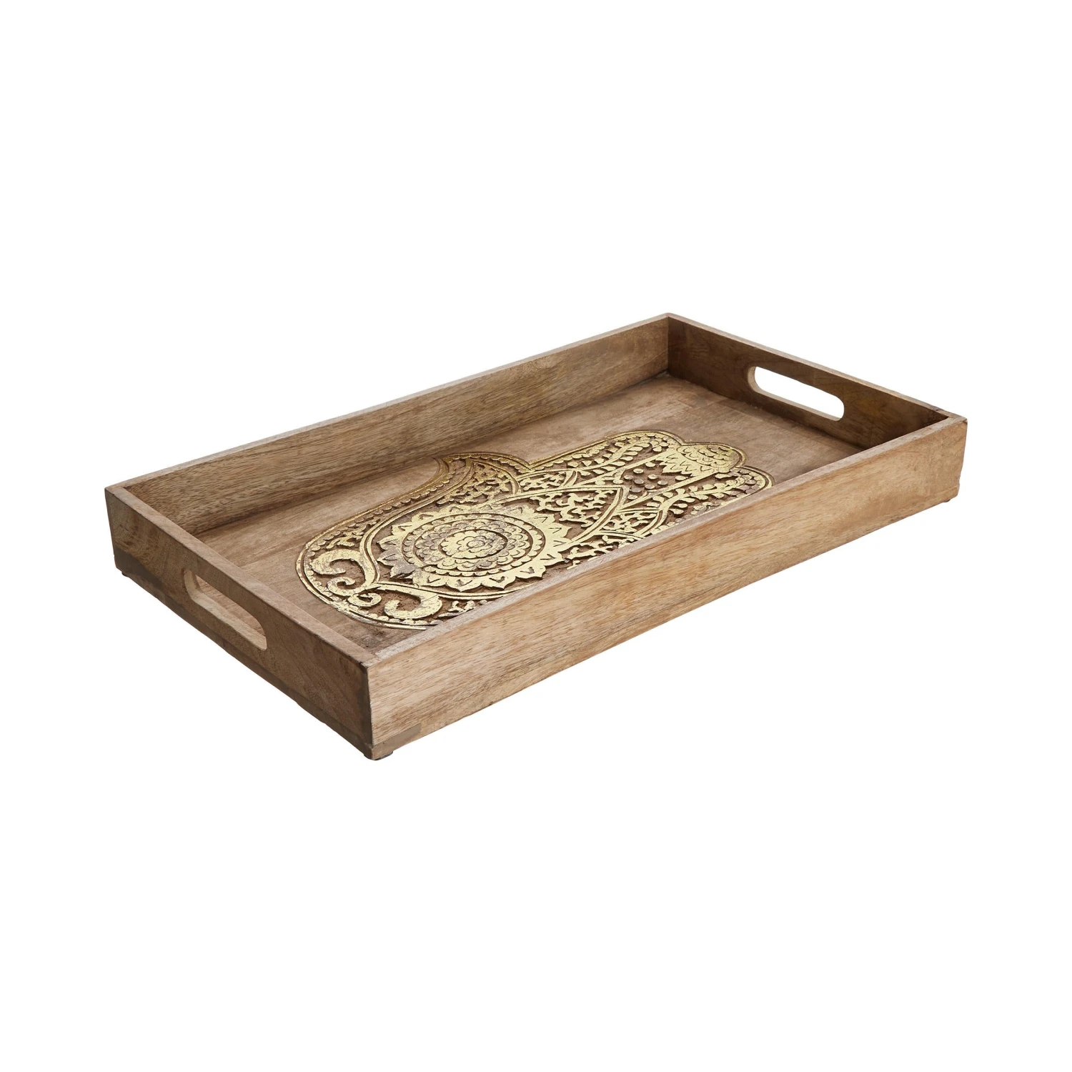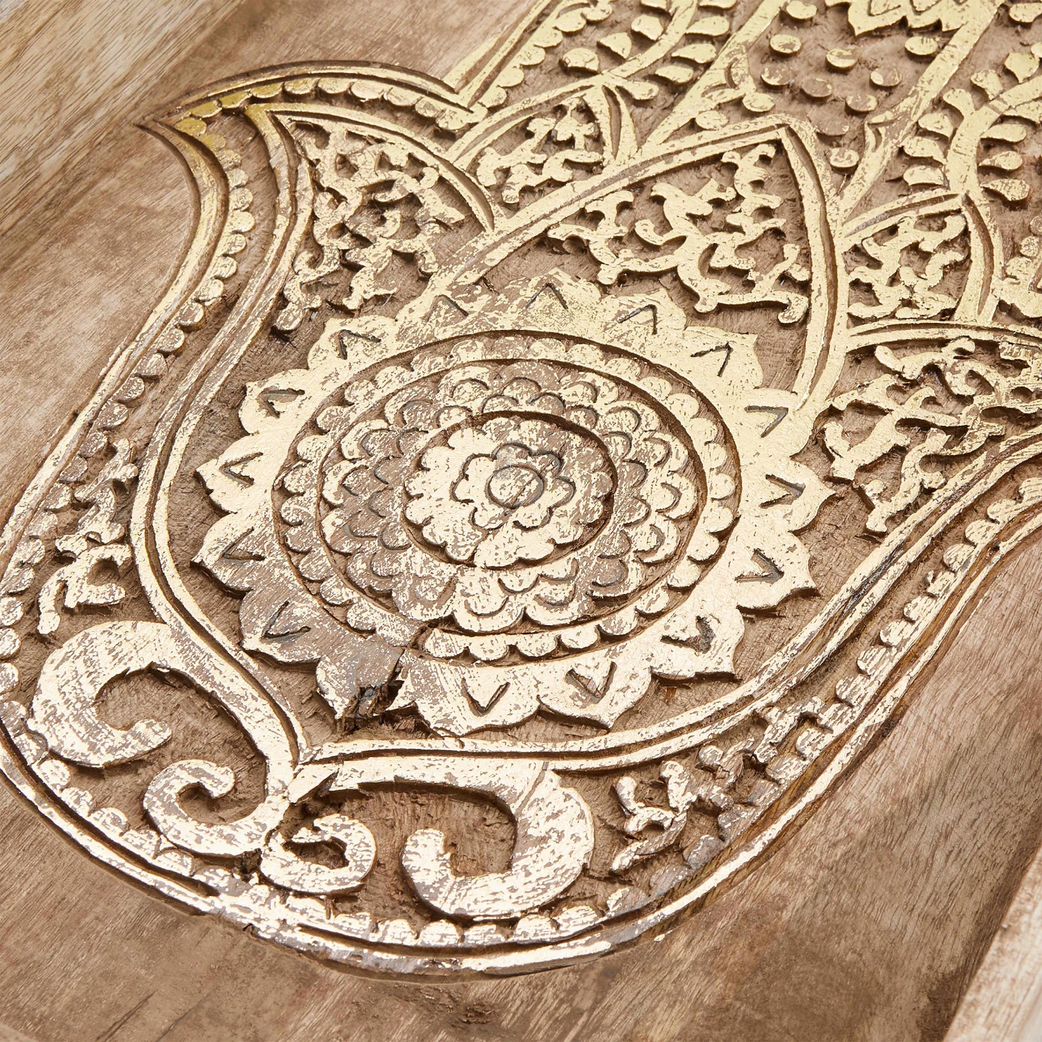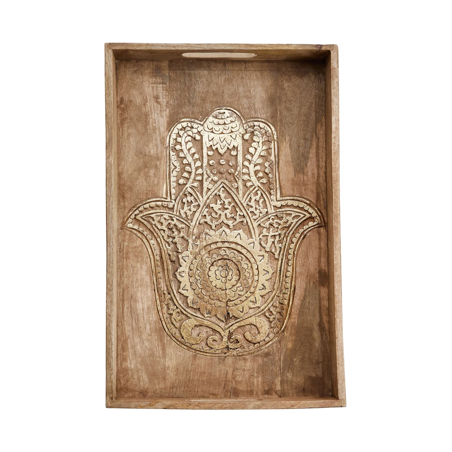 Schutz, Kraft, Glück: Beim rechteckigen Fatima Tablett mit Schnitzerei aus naturfarbenem Mangoholz liegt die symbolische Bedeutung auf der Hand. Als Hingucker sind die geschnitzten Hände kunstvoll und detailliert ausgearbeitet. Ein warmer Goldton lässt sie schimmern und noch plastischer wirken. Das alles macht das dekorative Tablett zu einem besonderen Objekt, das perfekt harmoniert mit den Boho-, Asia- und Oriental-Stil.