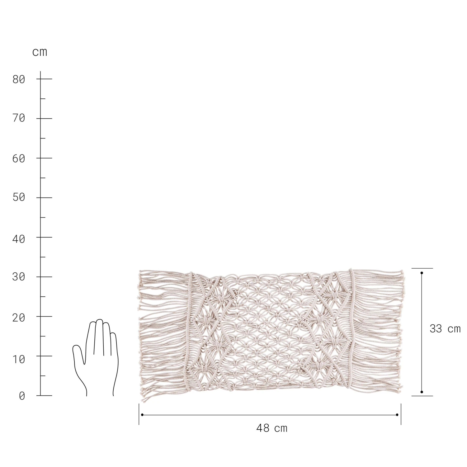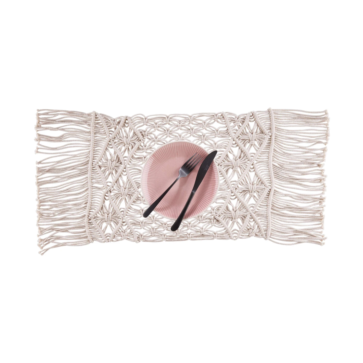 KnĂŒpft perfekt an die Wohntrends “Boho” und “Ibiza” an: Das MacramĂ© Platzset 48 x 33 cm aus creme-farbener Baumwolle setzt die traditionellen KnĂŒpfmuster formvollendet in Szene – hergestellt in aufwĂ€ndiger Handarbeit fĂŒr einen authentischen Look. Weitere MacramĂ© Accessoires fĂŒr Ihr Zuhause erhĂ€ltlich, ideal auch zum Kombinieren.