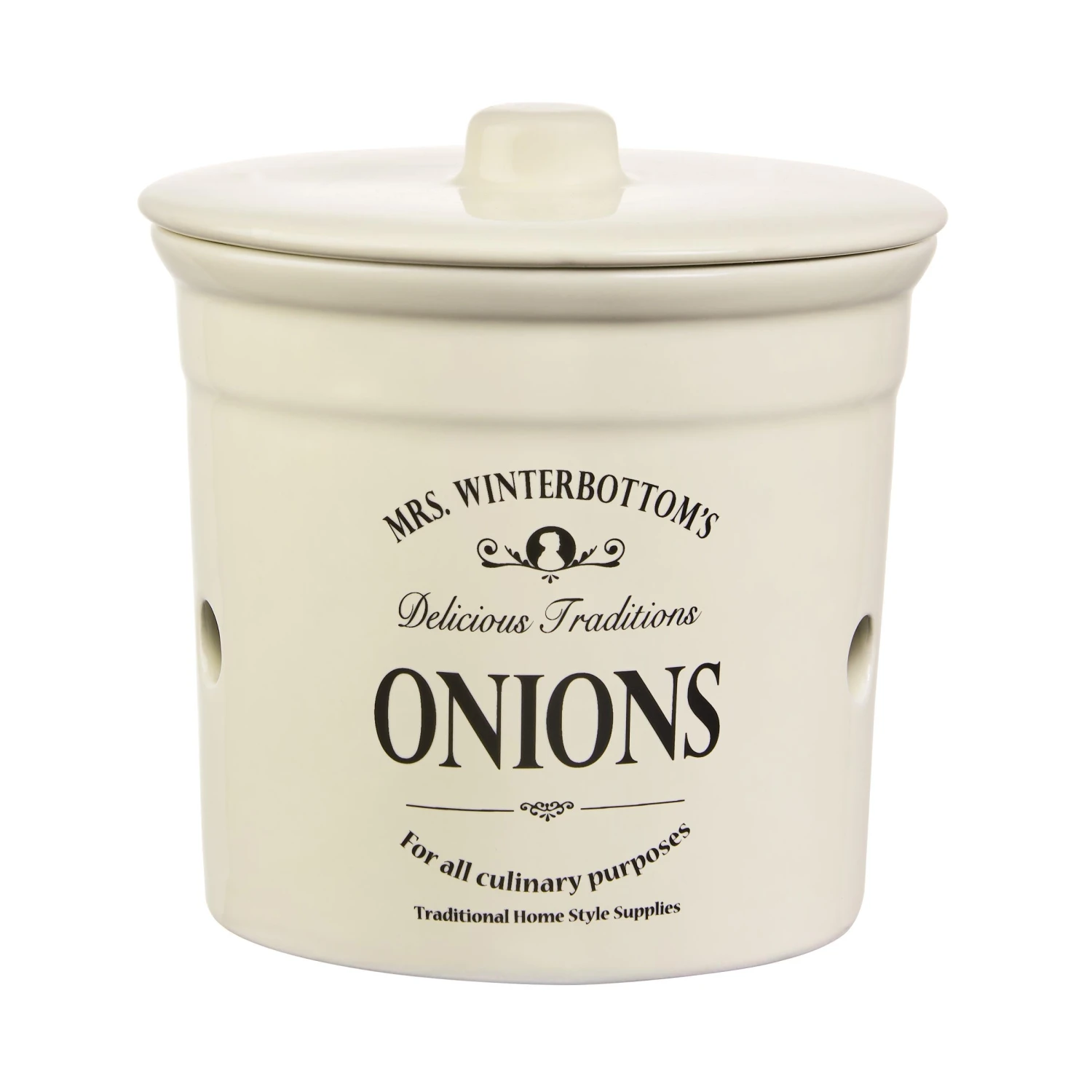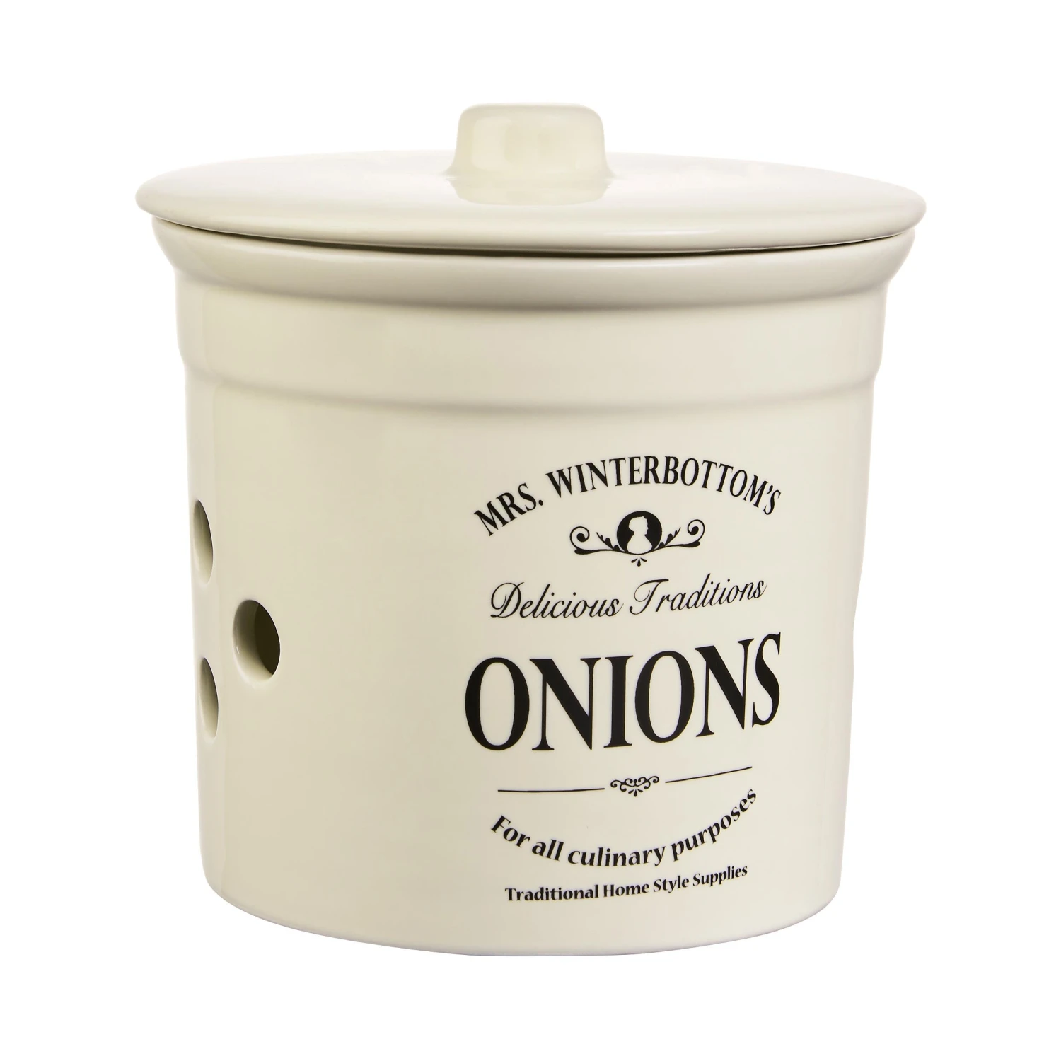 Weil auch Zwiebeln in Sachen Aufbewahrung äußerst eigensinnig sind, bekommen sie ihre eigene Dose. Mit Luftlöchern. Bei der Serie Mrs. Winterbottom´s ist an alles und jeden gedacht. Dies und das lässt sich mit den traditionellen Dosen, Flaschen, Töpfen, Schalen, Kannen etc. aufbewahren und/oder auftischen. Jedes Teil ist aus Dolomit exklusiv für Butlers gefertigt und trägt ein typisch englisches Dekor. Und natürlich passt alles so perfekt zusammen wie die Deckel auf die Töpfe oder die Metallausgießer auf die Flaschen.