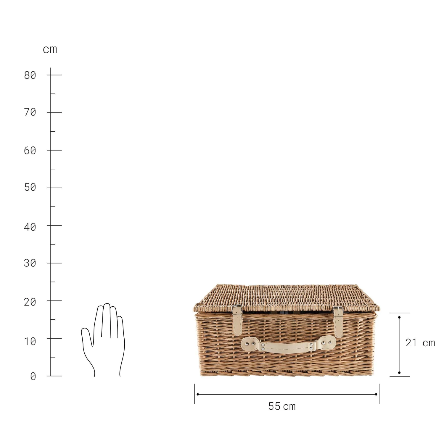 Auf der grünen Wiese picknicken mit echtem Keramikgeschirr – das hat Stil. Der traditionelle Picknick-Weidenkorb mit Griff ist innen mit gestreiftem Leinenstoff ausgeschlagen und mit Metallketten zum Halt des Deckels versehen. Er beinhaltet das Wichtigste für jeweils 4 Personen: 4 Teller, 4 Tassen, 4 Messer, 4 Gabeln, 4 Löffel, 1 Flaschenöffner, 1 Aufbewahrungsdose, 1 Kühltasche, 1 Salz- und 1 Pfefferstreuer. Alle Teile werden in dem Korb sicher verstaut und es bleibt genug Platz, um noch ein paar Köstlichkeiten einzupacken.