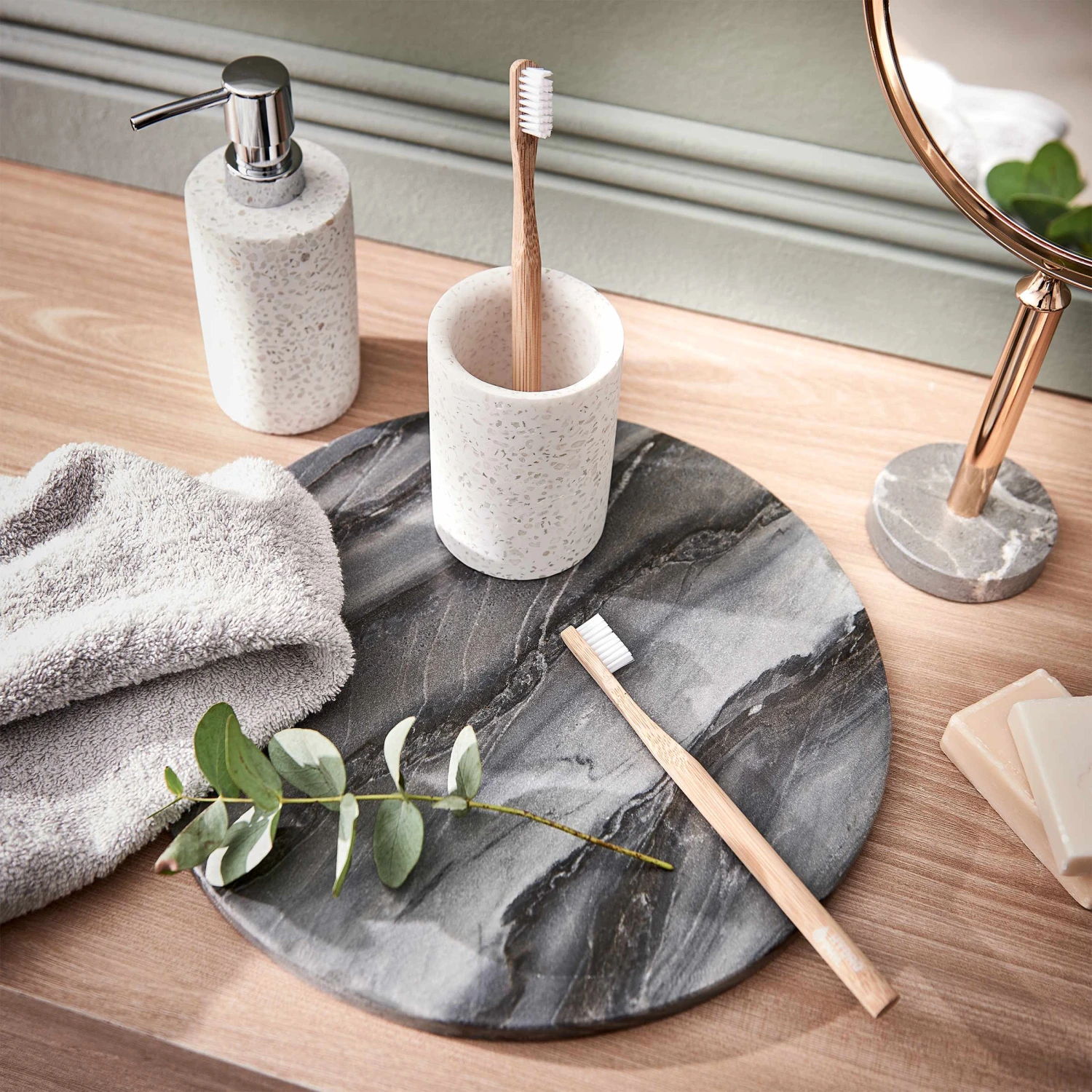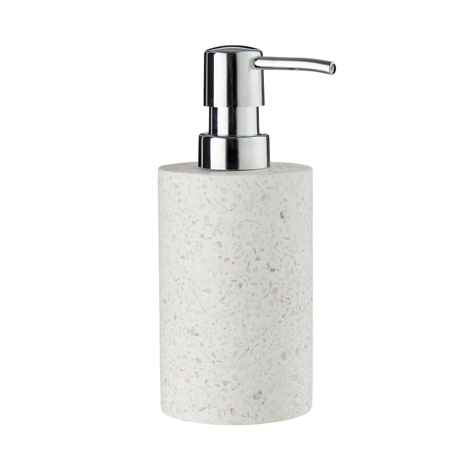 Mal was neues: Badutensilien in Terrazzooptik. Den Auftakt macht unter anderem der Samos Seifenspender in Weiß. Die klassische Zylinderform des Seifenspenders gepaart mit Terrazzo-Muster verleiht Ihrem Bad einen mediterranen Touch. Befüllt mit Ihrer Lieblingsseife bekommt der Seifenspender einen individuellen Charakter und wird so zum ganz persönlichen Badaccessoire. Auch passende Seifenschale und Zahnputzbecher erhältlich.