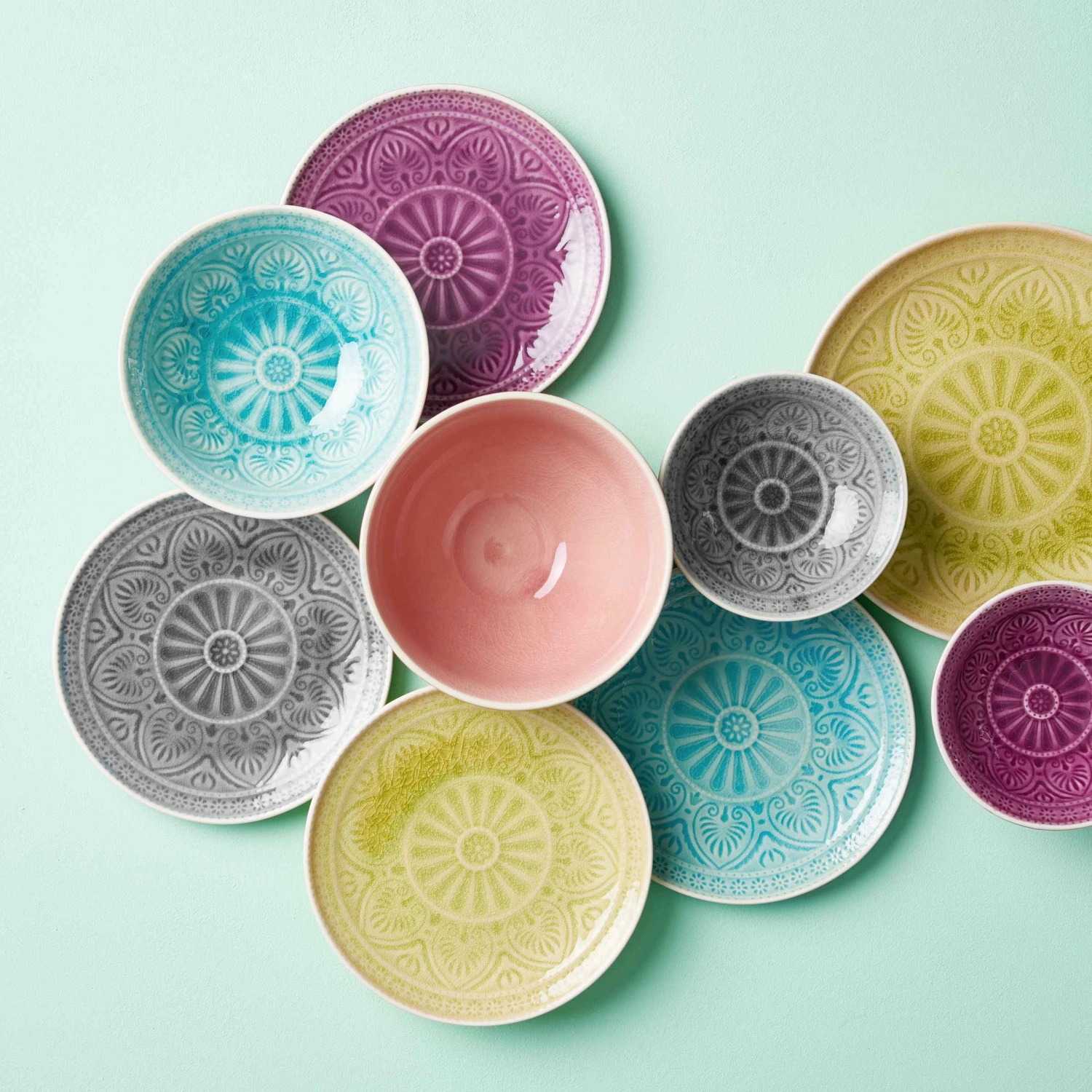 Jedes Teil des 12-teiligen Geschirrsets aus Steinzeug, bestehend aus Speisetellern, kleinen Tellern und Suppenschalen, die effektvoll glänzende Glasur in exotischen Farben (innen eher matt) unterstreicht die kostbare Optik. Was für ein sanfter Kontrast zu den sehr scharf gewürzten Speisen, die man in Padang und ganz Sumatra traditionell reicht.