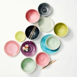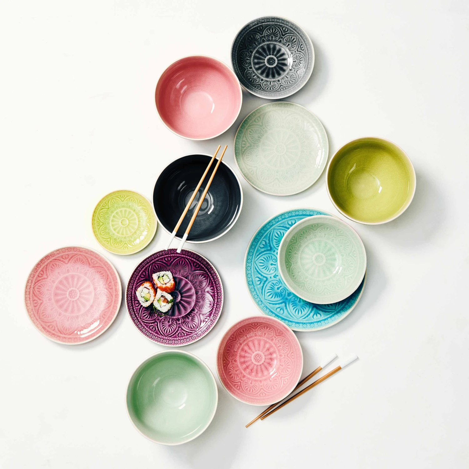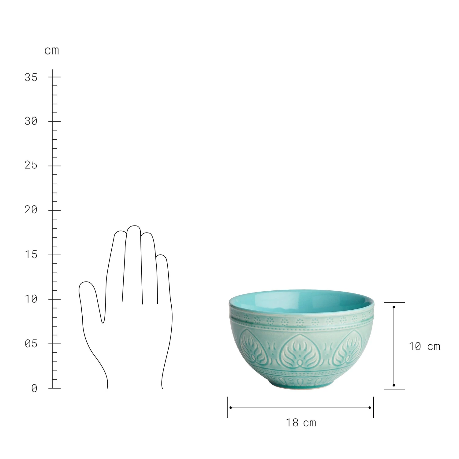 Scharfe GewĂŒrze und krĂ€ftige Aromen passen besonders gut zu dieser exotischen Sumatra Schalen aus Steinzeug. Das traditionelle Reliefdekor hebt sich optisch sanft unter der glatten Glasur der groĂen, bunten Schale ab. Die Suppenschale bietet einen echten Blickfang auf Ihrem gedeckten Tisch und lĂ€sst sĂŒdostasiatischen Flair aufkommen.