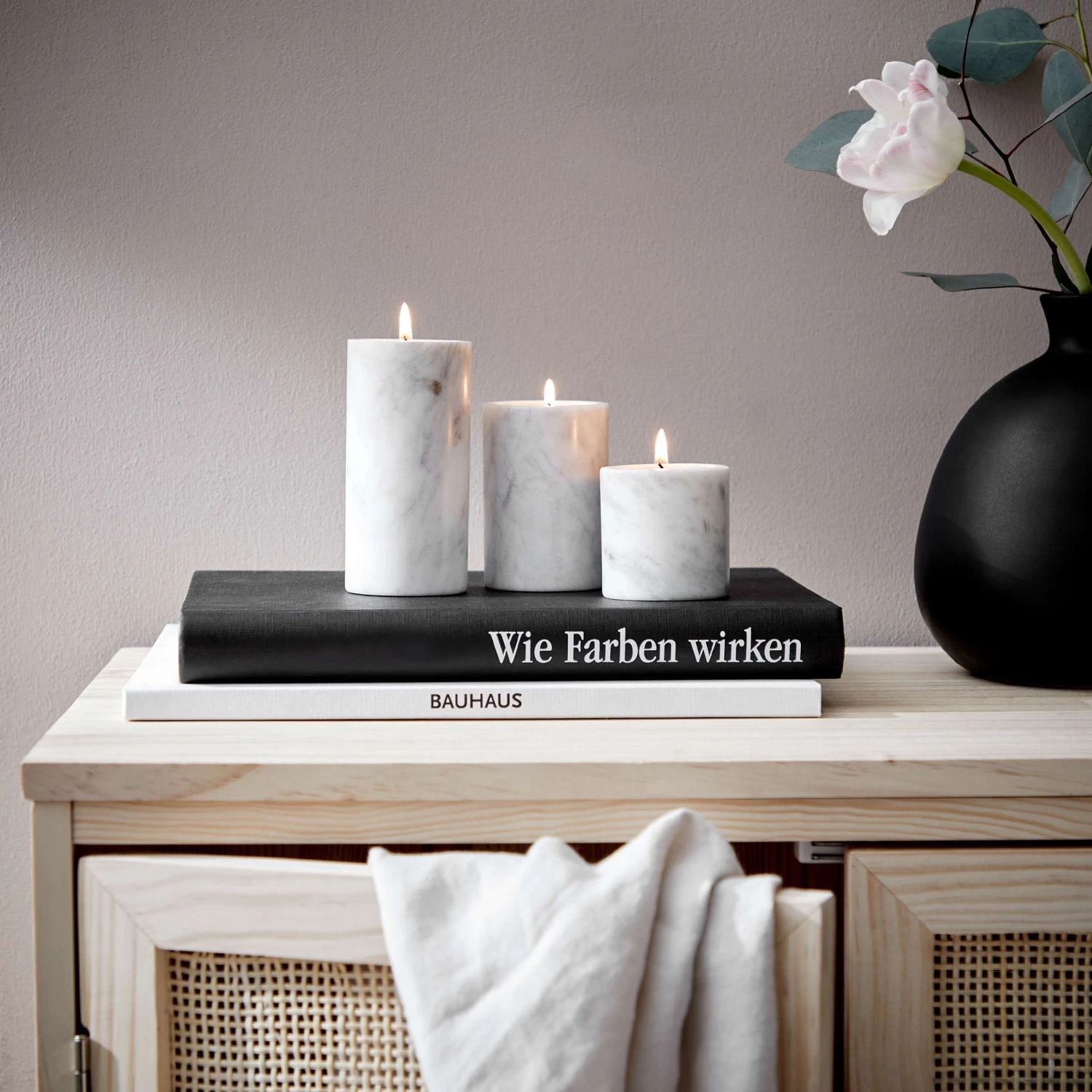 Weißer Marmor ist edel und so angesagt. Deshalb verlieben Sie sich auf den ersten Blick in den modernen Marble Teelichthalter im 3er Set und machen ihn ganz schnell zum erklärten Lieblingsaccessoire auf dem gedeckten Tisch. Oder sie platzieren die drei Teelichthalter im puristischen Design dekorativ auf einem Board oder Beistelltisch. Weitere Marble Deko Objekte und Kerzenhalter erhältlich, ideal auch zum Kombinieren.