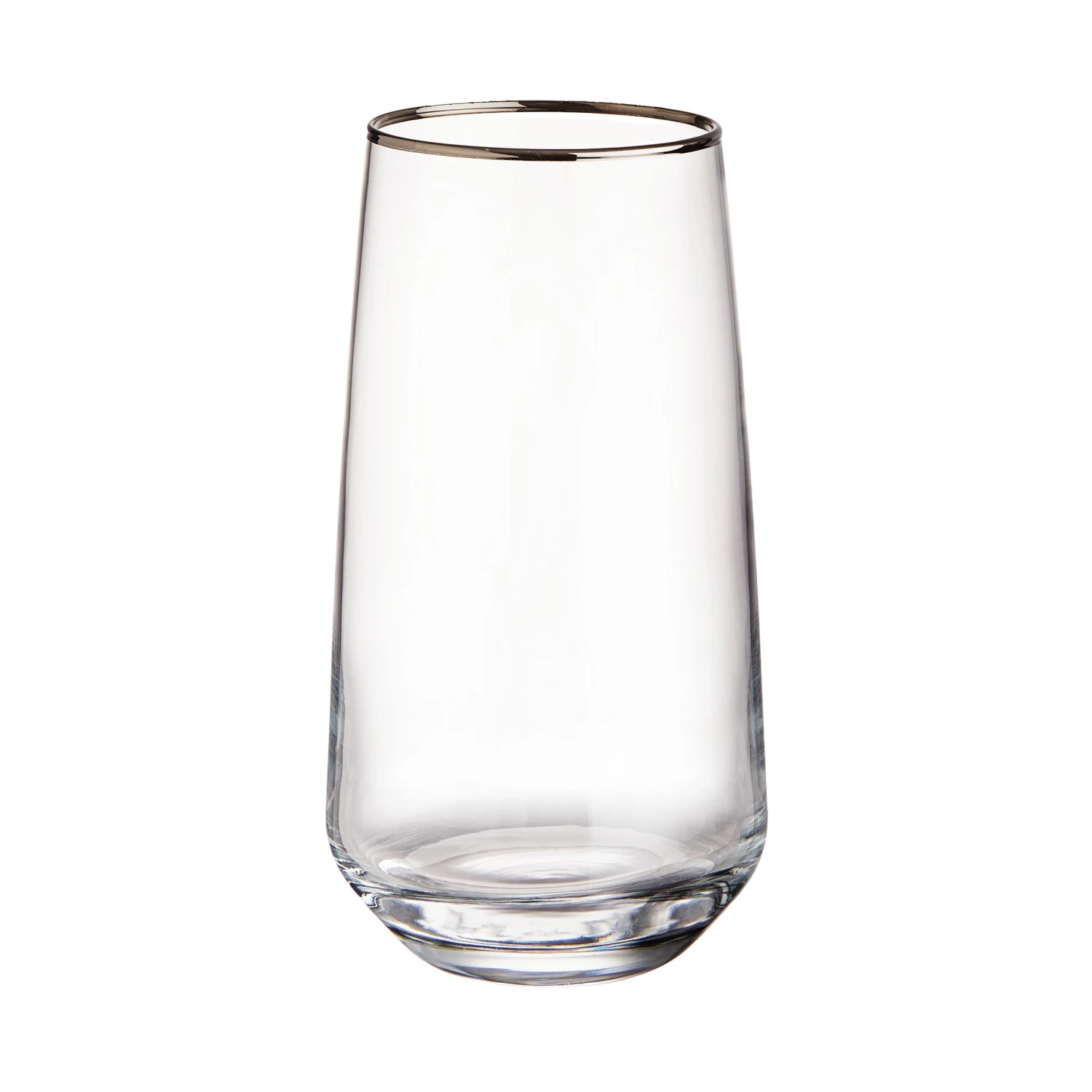 Da passt was rein: In unserem modernen Touch of Silver Longdrinkglas 480 ml im 6er-Set haben auch großzügig eingeschenkte Longdrinks Platz – inklusive einer ordentlichen Portion Eiswürfel. Da sitzen Sie und Ihre Gäste beim Essen und Feiern nicht so schnell auf dem Trockenen. Passendes Wasserglas erhältlich.