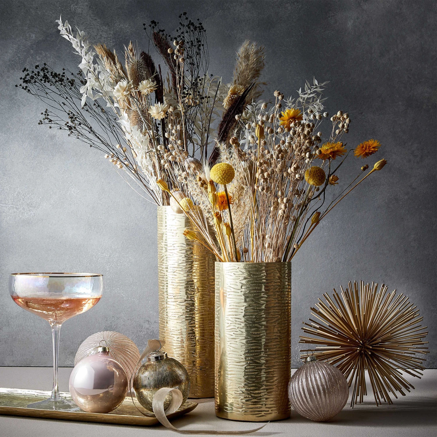 Die Aureo Vase aus Aluminium ist allen gewidmet, die sich an satten Goldtönen in ihrem Zuhause gar nicht sattsehen können. Seine strukturierte, leicht unebene Oberfläche sorgt für eine individuelle Optik und macht dieses schimmernde Deko-Objekt zum Hingucker. Passendes Tablett erhältlich, ideal zum Kombinieren.